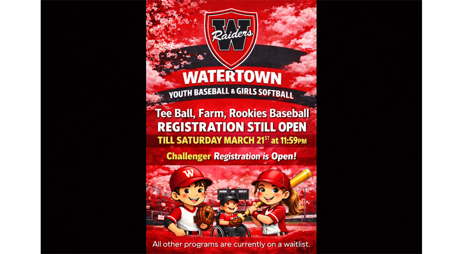 Saturday May 2nd will be Watertown Youth Baseball & Girls Softball Opening Day Celebration. More Information to come.